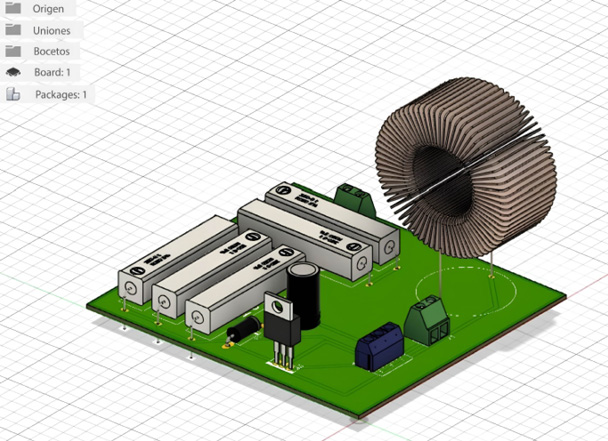 El siguiente paso fue el modelado 3D del circuito utilizando Fusion 360. Este software permitió visualizar y ajustar el diseño en un entorno tridimensional, garantizando la correcta disposición de los componentes y la compatibilidad física de los mismos en la placa de circuito. En la Figura 11, se muestra el modelo 3D del circuito antes de proceder a la fabricación.