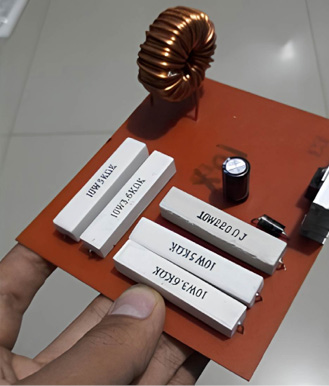 Finalmente, se fabricó el circuito impreso utilizando un método artesanal basado en transferencia térmica. Se imprimió el diseño de las pistas en papel fotográfico mediante una impresora láser, se transfirió el diseño a una placa de cobre virgen usando una plancha y se corroyó el cobre excedente con una solución de percloruro férrico. La Figura 11 presenta el circuito impreso terminado y listo para su ensamblaje.