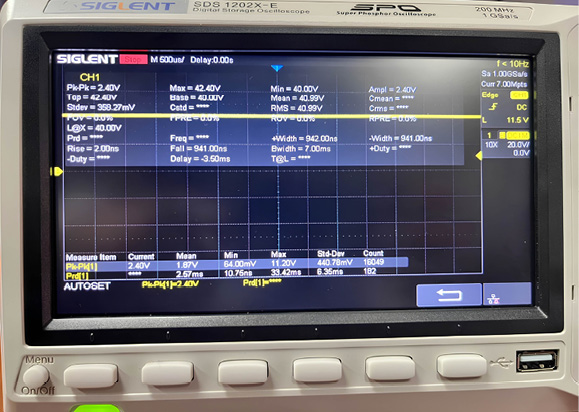 Las mediciones realizadas con el multímetro y osciloscopio muestran que el voltaje de salida promedio es de hasta 40,99 V.