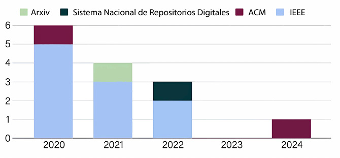 En base a los datos extraídos, se realiza un análisis que permite dar cuenta de las publicaciones por año, a partir del cual es posible determinar que si bien las publicaciones alcanzan un pico en el año 2021 decrecen en los años posteriores. Ello ha generado una menor cantidad de investigaciones que evidencien la importancia de la aplicación de una metodología de trabajo en proyectos de big data. En la Figura 2, se muestra la cantidad de publicaciones realizadas por año, la cual considera el rango 2020-2024 incluido en los criterios de inclusión.