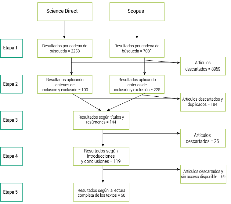 A partir de la cadena de búsqueda, en la primera etapa del filtrado se identificaron 2253 artículos en la base de datos Scopus y 7031 artículos en la base de datos ScienceDirect. En la segunda etapa, se aplicaron los criterios de inclusión y exclusión establecidos en la Tabla 1, y se seleccionaron 228 artículos de Scopus y 100 artículos de ScienceDirect, lo que resultó en un total de 328 artículos. En la tercera etapa, los artículos obtenidos de ambas bases de datos se combinaron, se eliminaron los duplicados y se revisaron tanto los títulos como los resúmenes relacionados con la generación automática de rutas para entregas, de los cuales se conservaron 144 artículos. En la cuarta etapa, se revisaron las conclusiones e introducciones de los artículos seleccionados para asegurar su relevancia y pertinencia, lo que resultó en la selección de 119 artículos. Finalmente, en la quinta etapa, se llevó a cabo la lectura completa de los textos, de los cuales se eligieron 50 artículos (Figura 1).