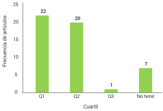 La Figura 2 muestra una distribución destacada en el cuartil 1 (Q1), que agrupa 22 de los journals seleccionados, lo que refleja un alto rendimiento y calidad en los estudios reportados. El cuartil 2 (Q2) cuenta con una representación ligeramente menor con 20 casos, mientras que el cuartil 3 (Q3) registra solo 1 caso. Por otro lado, se identifican 7 journals que no están clasificados en ninguno de los cuartiles, lo que indica que aún no han sido evaluados. Estos resultados destacaron la predominancia de estudios de alta calidad entre los seleccionados, con una representación significativa en los cuartiles superiores.