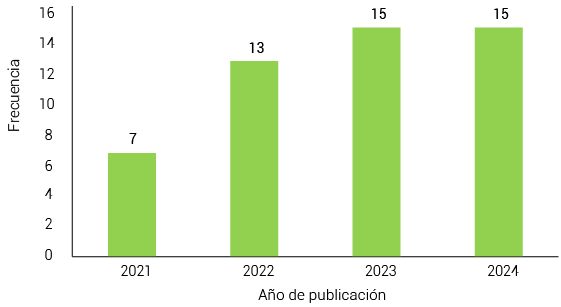 La Figura 3 muestra la frecuencia de publicaciones por año relacionadas con el tema de investigación. En el 2021, se registraron 7 publicaciones, mientras que, en el 2022, aumentó significativamente a 13 publicaciones, lo que reflejó un mayor interés en el área. Este interés se mantuvo en el 2023 y 2024, con un máximo de 15 publicaciones en cada año. Este comportamiento destacó la relevancia del tema como un área de estudio importante, especialmente en el desarrollo de soluciones innovadoras para la generación automática de rutas, impulsada por la necesidad de optimizar procesos logísticos y tecnológicos.