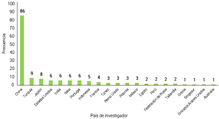 La Figura 4 muestra la frecuencia de investigadores por país en el campo de estudio. Se destacó un interés predominante en China, con 86 investigadores, lo que refleja un enfoque significativo en la investigación y desarrollo en esta área. Turquía y Japón también tuvieron una participación relevante con 9 y 8 investigadores, respectivamente, seguidos por países como Estados Unidos, India, Italia y Portugal, cada uno con 6 investigadores. En contraste, países como Francia, Túnez, Reino Unido, Polonia e Indonesia presentaron una menor representación, con 4 o menos investigadores. En América Latina, México (3) y Perú (2) evidenciaron un interés emergente en el tema. Estos hallazgos han resaltado una notable concentración de investigadores en Asia y Europa, con una participación más discreta de América Latina.