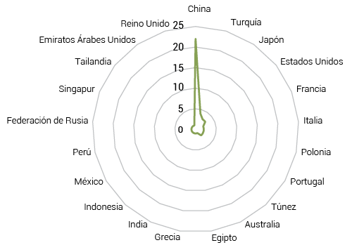 La Figura 5 muestra la frecuencia de publicaciones por país en el ámbito de estudio. Destacó China (22) como líder en contribuciones, lo que refleja un fuerte interés y enfoque en el desarrollo de estos temas. Turquía ocupó el segundo lugar, seguida por Japón y Estados Unidos, con 3 publicaciones cada uno. Países como Francia, Italia, Polonia, Portugal y Túnez también realizaron aportes significativos, con 2 publicaciones cada uno. Otros países, incluidos Australia, Egipto, Grecia, India, Indonesia, México, Perú, Rusia, Singapur, Tailandia, Emiratos Árabes Unidos y Reino Unido, tuvieron una participación más limitada con 1 publicación cada uno. Estas cifras evidenciaron una notable concentración de investigaciones en Asia, acompañada de una expansión hacia otras regiones como Europa y América Latina, donde países como México y Perú reflejaron un interés emergente, de lo que se subraya el enfoque multidisciplinario de esta tecnología.