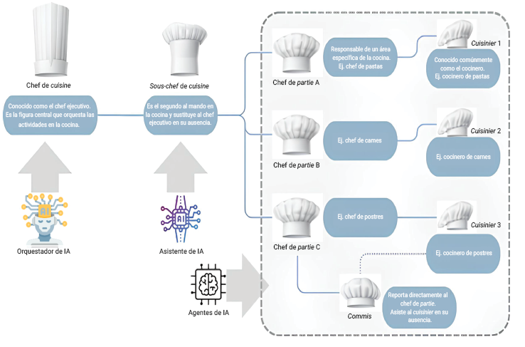 Una forma de entender los agentes y asistentes de IA es mediante la analogía del chef y su equipo en una cocina tradicional o brigada de cocina. El chef de cuisine es el responsable de coordinar las actividades, mientras que el sous-chef asiste en la gestión. Los chefs de partie se especializan en los platillos (por ejemplo: pastas, carnes, postres), apoyados por cocineros (cuisinier) y sus asistentes (commis). El chef ejecutivo inicia la cadena preparando el menú del día y dando instrucciones claras al chef de partie sobre la presentación de los diferentes platillos. El chef de cuisine detalla el menú y delega tareas al asistente de IA y a los agentes de IA según su especialidad.