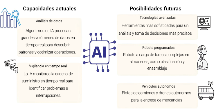 En la Figura 2, se ilustra la cadena de suministro con el equilibrio entre las capacidades actuales (análisis de datos y vigilancia) y las posibilidades futuras (tecnologías avanzadas, robots y vehículos). La imagen sugiere que los avances en IA y automatización, como la robótica y los vehículos automatizados, deben equilibrarse con las técnicas actuales basadas en aplicaciones y datos para obtener una visión holística del progreso tecnológico a ser implementado en una organización que desee introducir o mejorar el uso de agentes y asistentes de IA dentro de su proceso de logística.