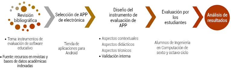 Esta investigación se compone de dos fases: una documental sobre el uso y la evaluación de las apps en electrónica con un enfoque constructivista, y otra exploratoria sobre la evaluación de usuario de las apps seleccionadas. En la Figura 1, se muestran las actividades realizadas.