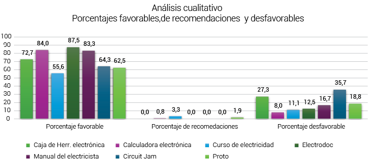 En la Figura 4, se observa que, de los ochenta y nueve comentarios, el 73 % fueron favorables, el 18 % neutrales o desfavorables y el 9 % recomendaciones. Curso de electricidad tuvo el menor porcentaje de comentarios favorables (55,6 %) y el mayor de recomendaciones (3,3 %). Circuit Jam recibió el mayor porcentaje de comentarios desfavorables o neutros (35,7 %) contra el 64,3 % de comentarios favorables, mientras que las otras aplicaciones no recibieron recomendaciones.