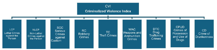 The composition of CVI, as shown in Figure 1, comprises nine categories of crimes, with the combination of indicators formed by a set of criminal variables. According to Lira (2013), by correlating these variables with socioeconomic information, the CVI aims to facilitate the understanding of the structural factors that likely influence criminal dynamics, as well as to support the development of public policies and strategies for the prevention, control, and mitigation of violence.