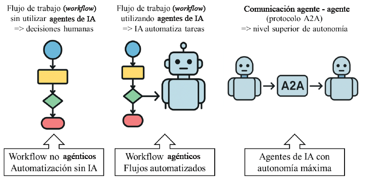 RESUMEN. El desarrollo de arquitecturas agénticas de inteligencia artificial (IA) ha dado lugar a nuevos modelos de interacción y automatización, entre los que destacan los flujos de trabajo basados en agentes de IA (agentic workflows) y la comunicación entre agentes A2A (agent-to-agent). Se presenta un estudio comparativo entre ambas arquitecturas, analizando sus principios de diseño, capacidades de coordinación humano-IA, escalabilidad y adaptabilidad en distintos entornos, así como sus obstáculos y desafíos. El análisis evidencia que, si bien los workflows agénticos proporcionan eficiencia y control en entornos estables con procesos delimitados, las arquitecturas A2A sobresalen en contextos distribuidos y heterogéneos, al ofrecer mayor flexibilidad y autonomía. Todo ello bajo la premisa de que la tecnología debe fortalecer, y no sustituir, las capacidades humanas, generando un impacto significativo en los ámbitos en los que más se requiere. Se examinan ejemplos representativos en los sectores de educación, salud e industria y se analiza cómo estas arquitecturas transforman procesos clave. Se presentan figuras y tablas comparativas que integran diversos enfoques entre ambas arquitecturas agénticas de IA. Finalmente, se discuten los desafíos técnicos y éticos asociados con su implementación y se plantean líneas futuras de investigación para una adopción responsable y eficaz de estas tecnologías.