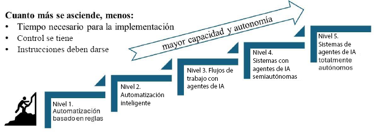Para comprender los niveles de automatización y de autonomía de los agentes de IA, Bornet et al. (2025) proponen cinco niveles para medir la automatización (más que madurez) del uso de la inteligencia artificial dentro de una organización (ver Figura 1).