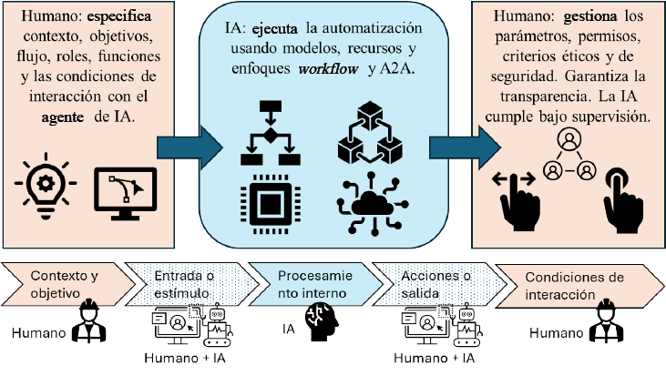 De la Figura 1 se desprende que el ser humano es quien establece los objetivos, los datos de entrada y los criterios éticos, mientras que la IA (workflow o agentes A2A) se encarga del procesamiento y la generación de respuestas. De esta manera, las capacidades normativas y de supervisión humanas delimitan y condicionan la autonomía técnica del agente, asegurando que su desempeño se enfoque en la eficiencia y la responsabilidad. Para más detalle, ver el Glosario (sección Colaboración humano-IA).