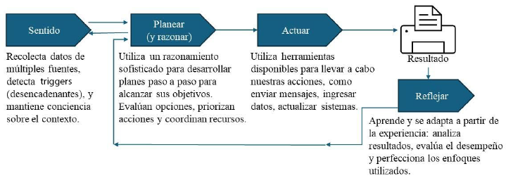 d) Reflejar (reflect): adquiere conocimiento con cada iteración y mejora su desempeño mediante un proceso de aprendizaje basado en la experiencia. Se incluyen el análisis de resultados, la evaluación del rendimiento y el perfeccionamiento continuo de los enfoques aplicados.