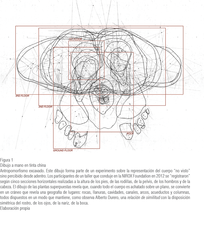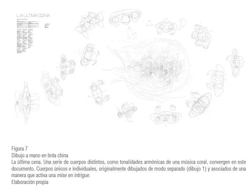 Todo lo representado pertenece a la arquitectura, también las habitaciones dispuestas en los ángulos como en el tiro de esquina. Todo gira en torno a la gran nada del claustro central, describiendo como sobre una mesa una narrativa cageiana con “pausas”, repeticiones, y silencios visuales: una mise en intrigue entre el espacio construido y el habitado, según una continuidad entre presencia y ausencia regulada por la geometría. Continuidad que Miralles traslada de una habitación a otra usando una sola plumilla 0,1 y un solo tipo de tinta, dictada por el movimiento continuo de la mano, por la importancia que le da el proceso, por negarse a incluir en el dibujo cualquier elemento tridimensional de la realidad y por su consecuente disminución a un plan abstracto inmóvil, como si el dibujo fuera un momento cero, un instante muerto en el fluir de la vida, donde los rituales, componentes fundamental en variación continua, no se pueden representar. Tal vez sea una multiplicidad a lo Cage, hecha plana y por lo tanto, vacía, compuesta según ese principio espacio-temporal de experimentación a través de un material como proceso de proyección, de drawing-through.