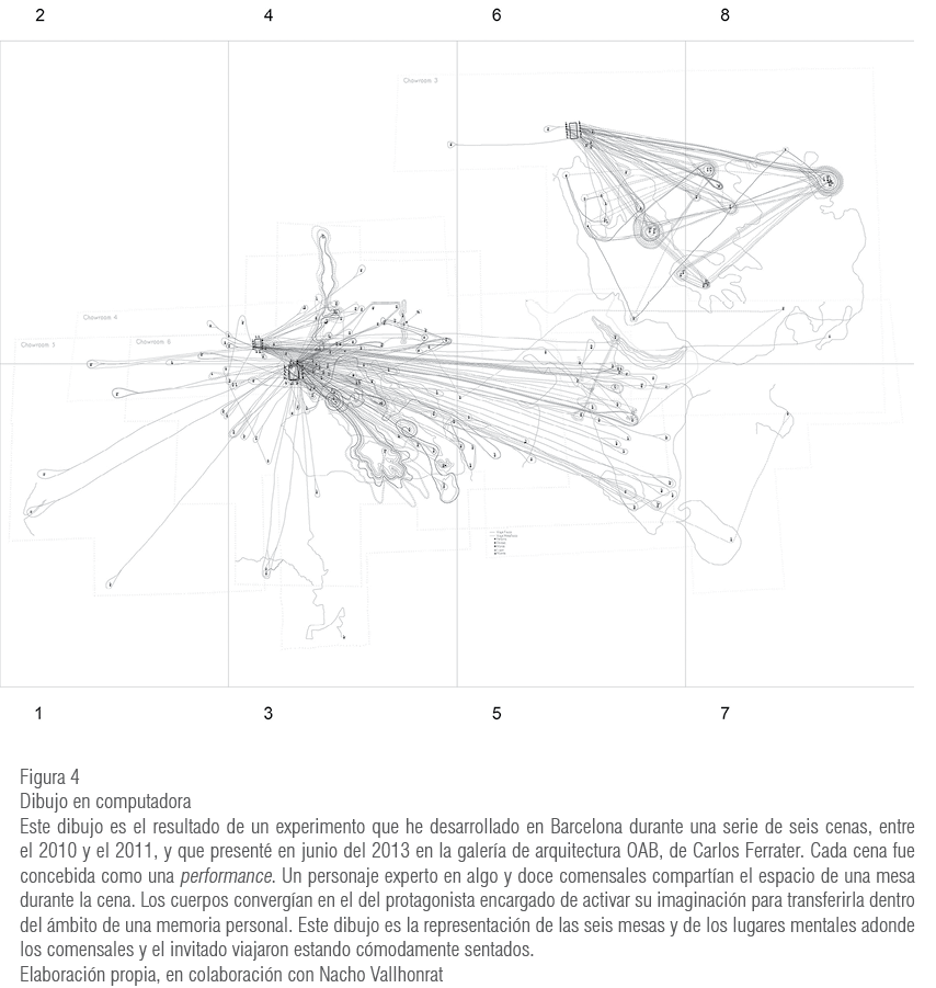 El espacio representado en la vivienda de la casa Mercaders es un espacio mental porque en esta planta uno no sabe cómo hacer para entrar, desde dónde tomar la escalera [[[[[. La casa no tiene otro contexto que ella misma, volcada toda hacia [adentro] como la mente: todos están ya adentro, o nadie • ha entrado jamás. La única puerta diseñada volcada es esa de la entrada a la vivienda, que invade los últimos peldaños de la escalera: está caída sobre el rellano y lo invade mientras se resbala hacia abajo]]]]]. Todas las demás puertas están dibujadas cerradas, con movimientos ya dados o a punto de darse, sobre todo la primera que está frente a la puerta de entrada: esa de la habitación de los arquitectos-habitantes. Aparte de tres sillas Eames, una gran mesa, el piano, dos lámparas de mesa de Louis Polsen, no hay muebles, solo cosas aferradas a las paredes [ ] como aquellas lagunas lo están las ventanas [] [] [], protuberancias de la arquitectura necesaria: librerías, repisas, paredes móviles, clóset, camas.