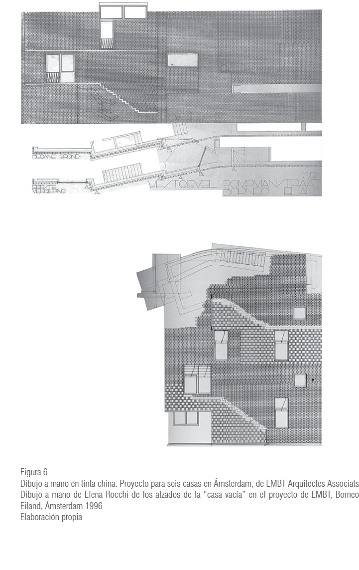 Miralles simuló esa demolición a partir de esponjar su propio dibujo, hipotetizando el retiro de una casa y su traslación sobre la del costado: un proceso de demolición que construye a través del dibujo. Lo hizo, presumiblemente, conforme a este razonamiento visible en los croquis iniciales: dispuso en modo abstracto las seis viviendas entre el proyecto de De Architectengroep y el de Kees Christiaanse, para completar la larga muralla de casas; extrajo entonces una vivienda y, disponiéndola sobre la del costado, simuló un ulterior gesto de las manos como para abrir esa fisura un poco más. A través del dibujo, simuló el tiempo de la arquitectura construyendo la densidad de la ciudad y al mismo tiempo, su esponjamiento: usó la simulación de la planificación como instrumento para espaciar el proyecto. El pasaje, la casa vacía, dibuja la transición entre lo externo de la ciudad, bien compuesto y controlable en perspectiva de los habitantes, y el interior, entendido como lugar de la experiencia del habitar: un pasaje que espacia la vivienda, no desde adentro sino desde afuera; un pasaje obligado entre casa y casa que asume la misma importancia que la casa misma, el generador de esa “sublime continuidad” entre interior y exterior, a la cual se refería Geuze todo el tiempo.