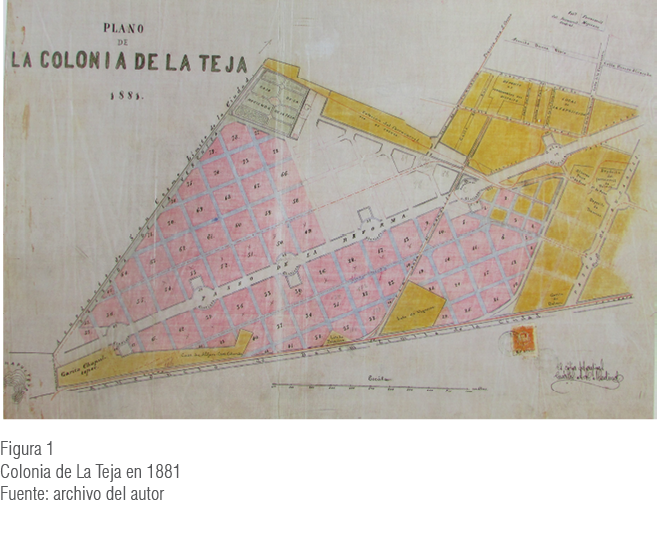 La colonia4 Juárez es producto de la incipiente expansión urbana, dispersa y fragmentada que esta ciudad experimentó al finalizar el siglo xix. El desarrollo urbano decimonónico es una huella de origen que se repite en el transcurso de la historia: la ciudad se expande, de acuerdo con intereses inmobiliarios, en partes fragmentadas y dispersas sin un proyecto conjunto. Juárez es la unión de varias colonias que surgieron en diferentes momentos y con distintos intereses, lógicas y trazas. El triángulo norte fue parte de la colonia de los Arquitectos; dos hileras de manzanas en el oriente fueron parte de la colonia Bucareli; y el resto de ellas conformaron las colonias Del Paseo o de La Teja. En la figura 1, mapa fechado en 1881, la colonia de La Teja, abarca lo que ahora son las colonias Cuauhtémoc y Juárez, al norte y sur del Paseo de la Reforma.