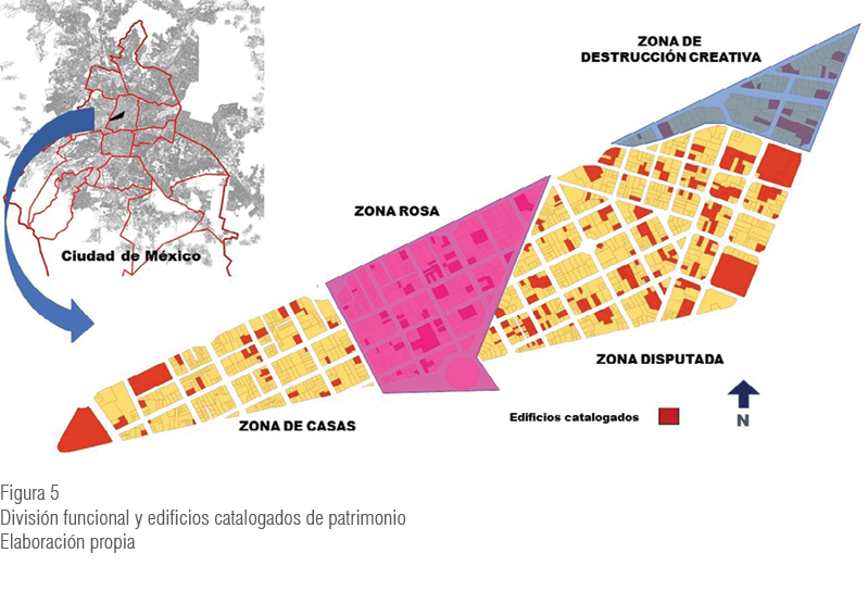 La colonia Juárez presenta áreas especializadas con funciones homogéneas (figura 5): la Zona Rosa, que es un distrito turístico y de entretenimiento, es el sector más terciarizado y despoblado; ahí se desarrolla una intensa actividad diurna y nocturna. El triángulo norte es una zona que es objeto de destrucción creativa, donde edificios de hasta 15 pisos han sido recientemente derruidos para construir torres de más de 40 pisos. La parte suroeste es un sector de casas unifamiliares de clase media, algunas de ellas transformadas en oficinas. La parte sureste es la zona más poblada y diversa en términos de vivienda, usos del suelo y población residente. Es el sector más disputado entre inversionistas y usuarios de mayores ingresos versus los antiguos moradores, así como entre nuevos y tradicionales comercios y servicios. Es el epicentro de la protesta vecinal.
