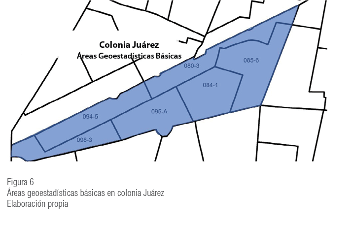 La colonia Juárez presentó un crecimiento de 775 personas y 2368 viviendas entre el 2000 y 2010, según Inegi (2000 y 2010). Las áreas geoestadísticas básicas (AGEB) menos habitadas en el 2000 colindaban con el Paseo de la Reforma, seguidas por la Zona Rosa y el sector de casas unifamiliares; mientras que las AGEB más habitadas se ubican al sureste de la colonia (tabla 1 y figura 6).