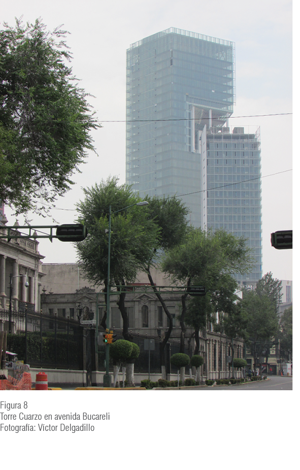 El Paseo de la Reforma es una avenida que actualmente padece una gran presión inmobiliaria con edificios cada vez más colosales. Los megaproyectos edilicios se afianzaron con la política de los corredores turísticos de López Obrador (Gobierno del Distrito Federal, 2005) y la modificación del Programa Delegacional de Desarrollo Urbano (Jefatura de Gobierno, 2008), el cual permite hacer cualquier uso del suelo y construir 40 pisos en Paseo de la Reforma, así como 25 pisos en la Glorieta de Insurgentes (Jefatura de Gobierno, 2008). Márquez (2016) contabilizó 27 torres construidas entre el 2001 y 2015, y determinó que este paseo era el corredor terciario más emblemático de la zona metropolitana. He contabilizado 13 desarrollos