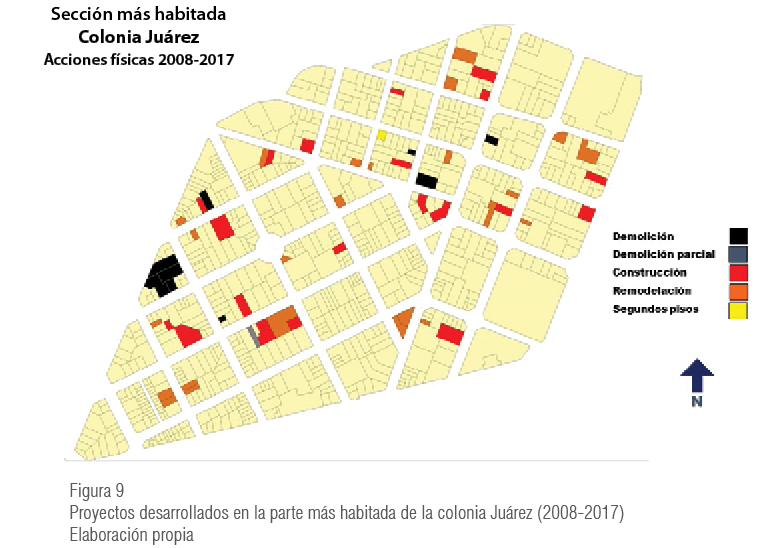 En un trabajo reciente, Romero (2017) señala que en la colonia Juárez, entre el 2002 y 2013, se llevaron a cabo 29 proyectos de viviendas media, residencial y residencial plus. Sin embargo, en el trabajo de campo realizado en esta investigación —que compara junio del 2008 con junio del 2017—, se ha consignado en la zona más habitada de la Juárez 55 proyectos diversos, como viviendas, comercios y servicios (figura 9), destinados a consumidores de mayores ingresos: remodelación de 25 inmuebles (figura 10), construcción en 21 predios (figura 11), demolición de 9 predios5.