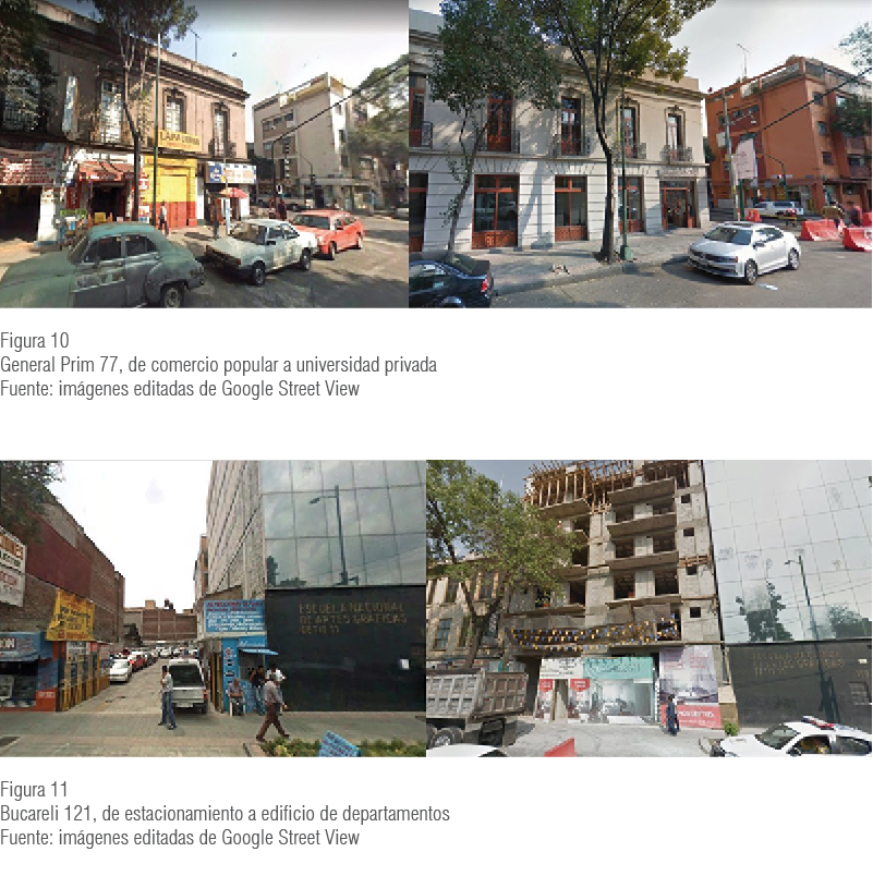 Los precios de las nuevas viviendas, servicios y comercios son inasequibles para la mayor parte de la población residente. Los valores del suelo en las delegaciones centrales se triplicaron entre el 2000 y el 2012 (Delgadillo, 2014). En la Juárez se construyen fundamentalmente viviendas tipo residencial y residencial plus con precios de entre 2 millones y 3,6 millones de pesos mexicanos6. Además de esta exclusión, en esta parte del barrio se han efectuado desalojos directos como condición para desarrollar proyectos inmobiliarios destinados a otra población, y desplazamientos indirectos a partir del incremento de los montos de alquiler y del impuesto predial.