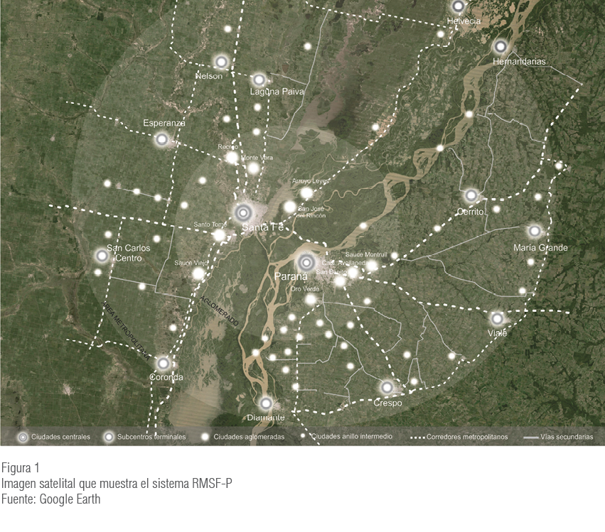 Cabe señalar que la RMSF-P tiene como particularidad la duplicación de su ciudad central y define una configuración bicéfala, conformada por Santa Fe y Paraná y sus hinterlands. Se trata de dos centros urbanos de similar jerarquía e importancia simbólica, circunstancias históricas comunes, cierta complementariedad funcional y un interés de larga data por alcanzar una interacción más intensa y efectiva. Estas localidades están separadas por el río Paraná y conectadas por un túnel subfluvial, inaugurado en 1969; asimismo, se mantiene la perspectiva de una nueva conexión vial, que podría materializarse en la próxima década2. Cada núcleo urbano reúne localidades aglomeradas que conforman el Gran Santa Fe y el Gran Paraná. Así, se determina un primer nivel de metropolización, que puede entenderse como el Área Metropolitana Santa Fe-Parana (AMSF-P); y un segundo nivel, la RMSF-P, que completa el sistema con un anillo de ciudades perimetrales con atributos de subcentros y un conjunto de pequeñas localidades en el área interior a tal límite virtual.