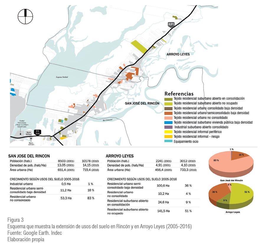 En este sector se reconoce una expansión acelerada que comenzó en la localidad de San José del Rincón hasta casi colmatarla. En los últimos años, tal como se observa en la figura 3, el crecimiento relativo se ha enfatizado en la localidad de Arroyo Leyes y ha alcanzado un segundo avance de extensión puramente residencial, difuso, de baja densidad y con condiciones de riesgo hídrico.