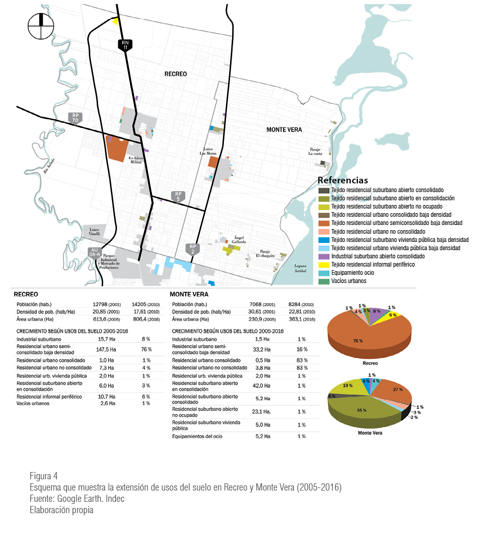 Entre los factores determinantes de esta modificación destaca el crecimiento demográfico y físico de la ciudad de Santa Fe. Ha cubierto casi la totalidad del suelo de su jurisdicción con usos urbanos y ahora demanda de las localidades vecinas el soporte territorial para seguir potenciando su crecimiento. Así es como el crecimiento se orienta predominantemente a una tendencia expansiva e instala un proceso de conurbación que evidencia fuertes vinculaciones entre la ciudad central y los distritos aledaños, como se da claramente con Recreo y Monte Vera al norte. Estas localidades han acelerado la división de sus suelos y han mutado los usos productivos predominantes a nuevos usos residenciales (Soijet, Mantovani y Peralta, 2016).
