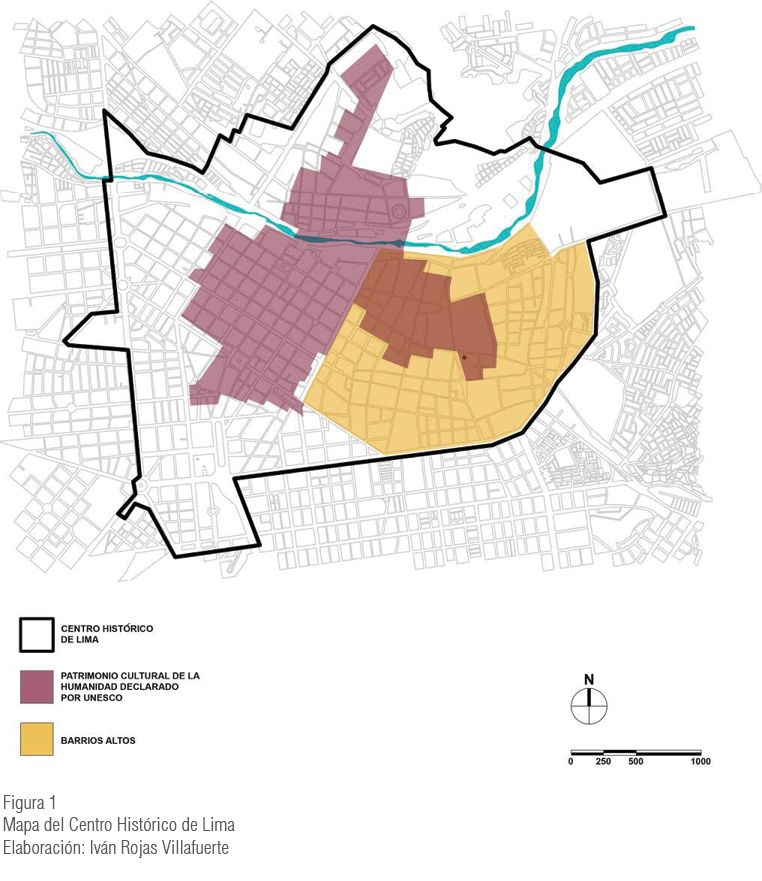El Centro Histórico de Lima (CHL), declarado en 1991 Patrimonio de la Humanidad1 por la Unesco, rescata los valores culturales e históricos encerrados en un sector de su territorio, que es un testimonio de la transformación social y espacial ocurrida en el país desde el siglo xvi hasta la actualidad, la cual se evidencia en la estructura física que mantiene. El CHL tiene una extensión de 1 022,81 Ha, de las cuales 68 % pertenecen al distrito de Cercado de Lima, 28 % al distrito del Rímac y 0,4 % a otros distritos. El área declarada Patrimonio Cultural de la Humanidad es solo el 23 % del total del CHL (Programa Municipal para la Recuperación del Centro Histórico de Lima [Prolima], 2014).