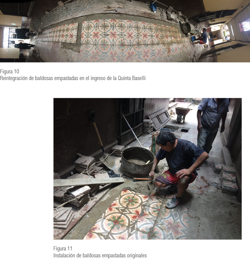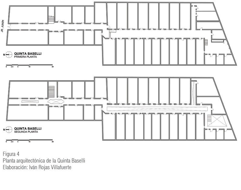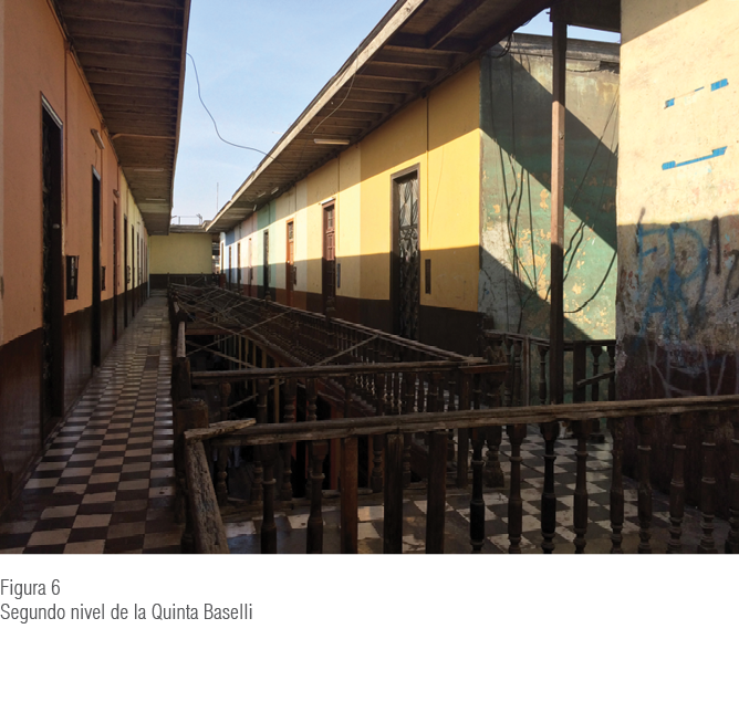 La Quinta Baselli, predio base del programa modelo propuesto, fue edificada en 1929 y se ubica en Jr. Junín 1342, Barrios Altos. La quinta cuenta con 72 unidades inmobiliarias, de las cuales dos son de uso comercial y se localizan en el frontis del predio, mientras que 70 son de uso residencial y se encuentran en el interior. La quinta comprende seis unidades deshabitadas, de las cuales dos se encuentran derruidas por colapso desde el 2002 y cuatro por la ausencia de sus propietarios8. Arquitectónicamente, el recinto de 13 metros de fachada por 100 metros de fondo está conformado por dos niveles: el primer nivel está construido con adobe y el segundo con quincha. Dispone de dos accesos verticales fabricados de madera, el primero de estos tenía acabado de mármol de Carrara, pero desapareció durante la década de 1980. Espacialmente, el recinto dispone de un solo ingreso principal por el cual se accede a las unidades de vivienda ubicadas a lo largo de tres patios centrales de uso común, que evidencian su colorido gracias al acabado en baldosa empastada, de la que solo quedan rezagos. En un inicio, la quinta contó con servicios básicos de agua y desagüe de uso común, y se destinó la batería de servicios higiénicos al fondo del inmueble. Hoy está en desuso, ya que los predios cuentan con instalaciones de servicios de luz, agua y desagüe independientes. En términos sociales, la Quinta Baselli está compuesta por 20 % de propietarios, 30 % de posesionarios y 50 % de inquilinos. Según la World Monuments Fund, desde el 2008 la Quinta Baselli ha sido catalogada como uno de los 100 inmuebles en riesgo del CHL debido al deterioro y la falta de mantenimiento de sus instalaciones.