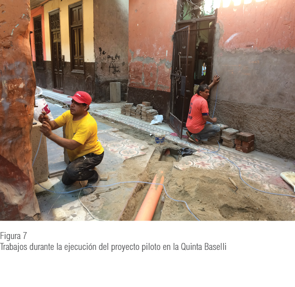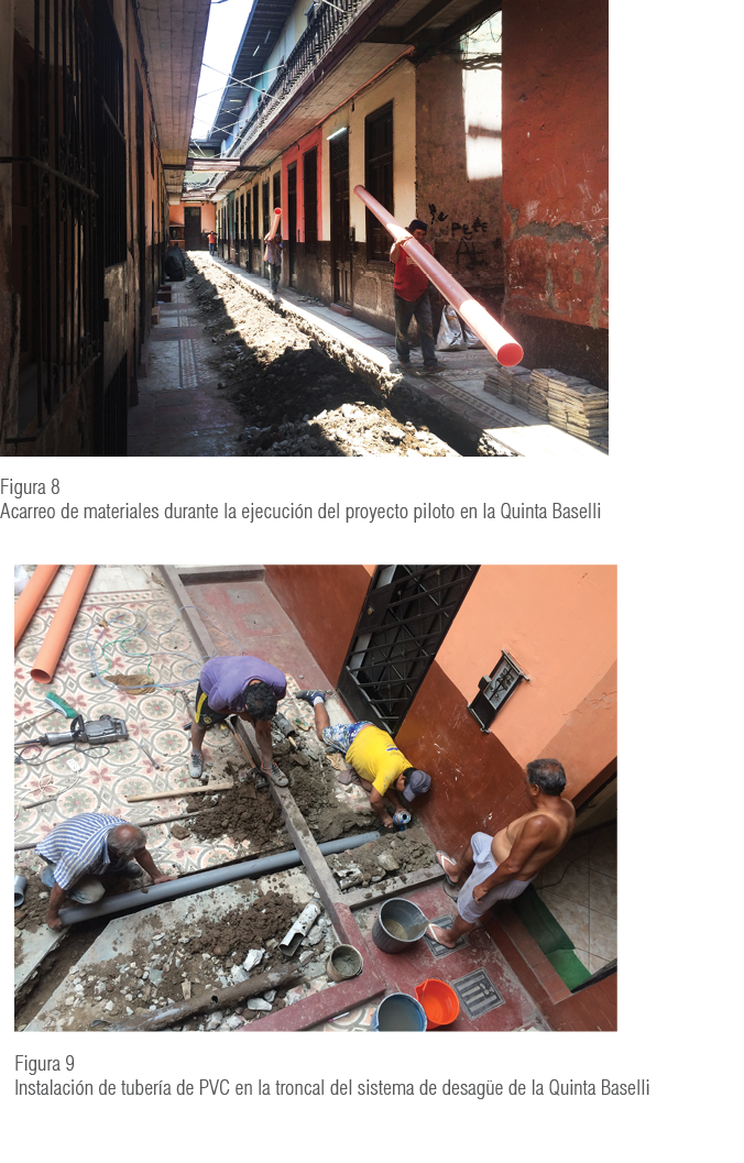 La ejecución del programa piloto en Quinta Baselli comenzó en noviembre del 2016 y se llevó a cabo durante dos meses y medio, pero solo se efectuó la primera etapa por poca disponibilidad de presupuesto. Específicamente, la primera etapa del modelo descrito anteriormente consistió en la solución del servicio de alcantarillado, ya que era fuente de debilitamiento por humedad de la base de las estructuras de abobe del primer nivel. Esto ponía en riesgo la capacidad portante del edificio, así como la salud de los residentes a raíz de los recurrentes afloramientos de aguas servidas.