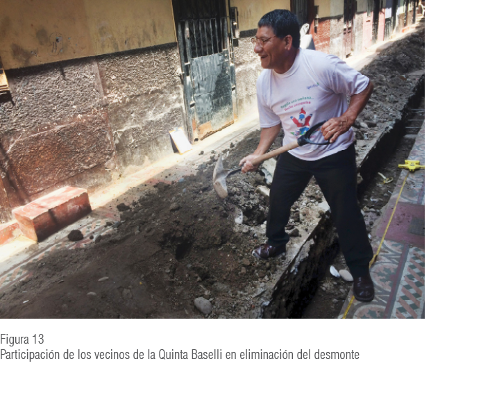 Finalmente, se debe señalar que la iniciativa vecinal, como se observa en la intervención de la Quinta Baselli, debe ser tomada como una estrategia inicial, ya que el mejoramiento del sector debe incluir la cooperación de todos los actores con injerencia en Barrios Altos, para así garantizar la repetición y sostenibilidad de las iniciativas.