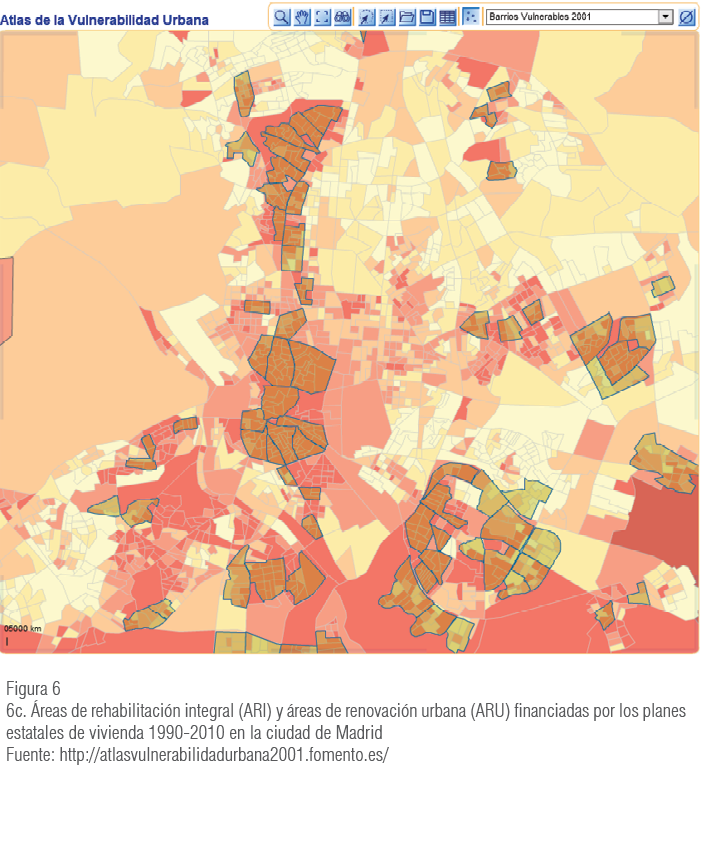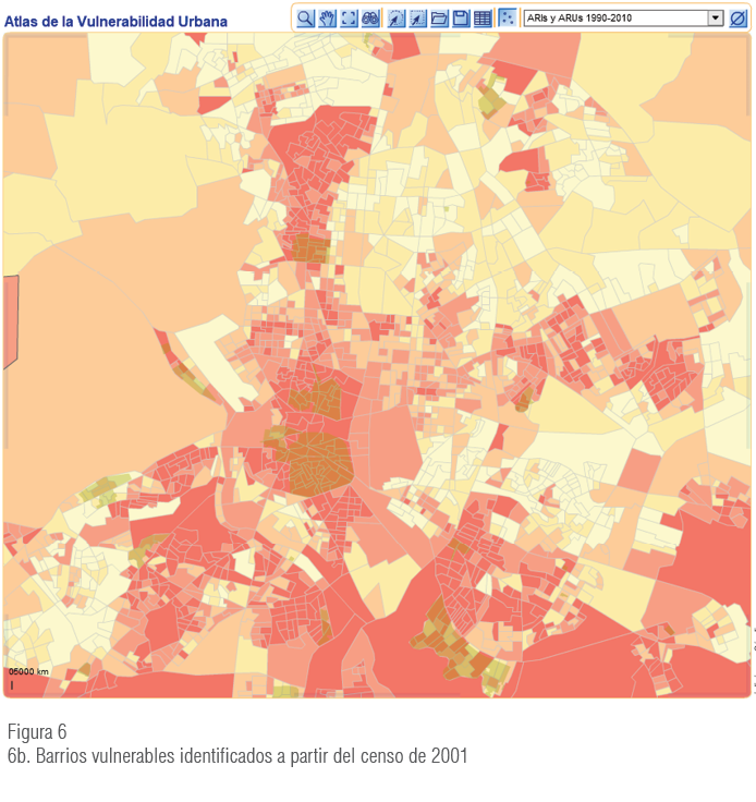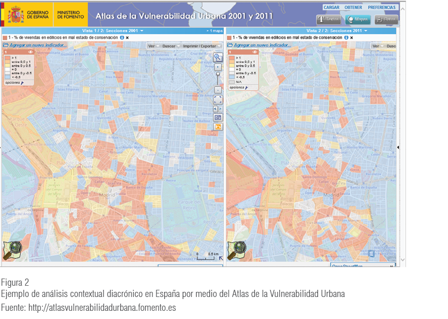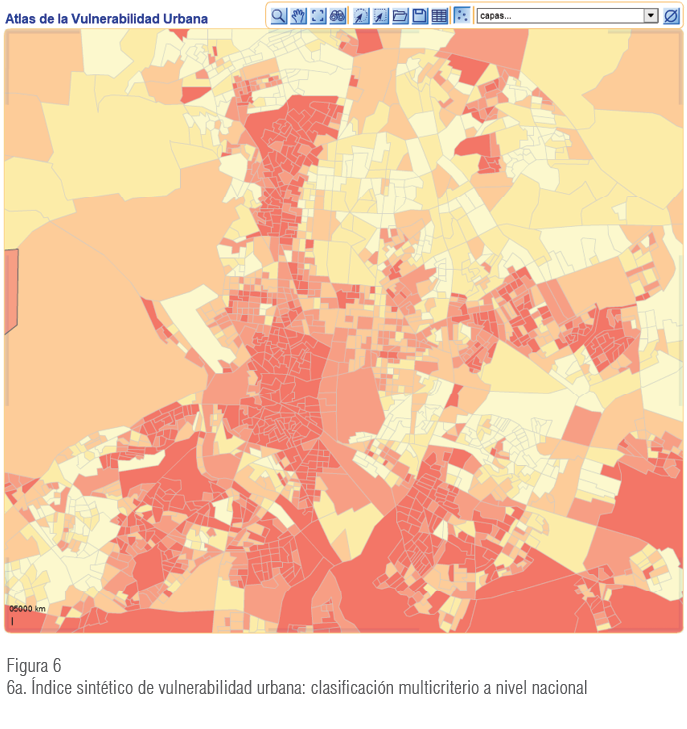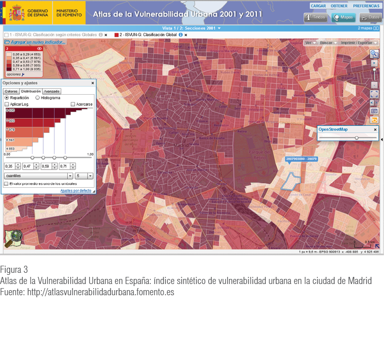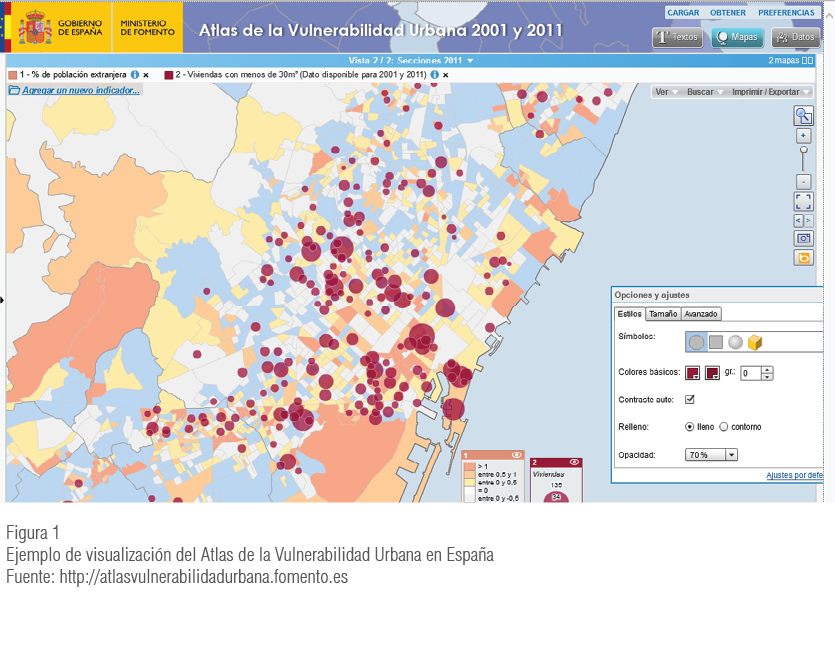El Atlas de la Vulnerabilidad Urbana en España (Ministerio de Fomento, 2015b) es una aplicación de cartografía dinámica en línea que permite analizar las múltiples dimensiones de la vulnerabilidad urbana, en el ámbito de sección censal, en todos los municipios de España. Se ha realizado a partir de los datos de los censos de población y viviendas del 2001 y 20117.