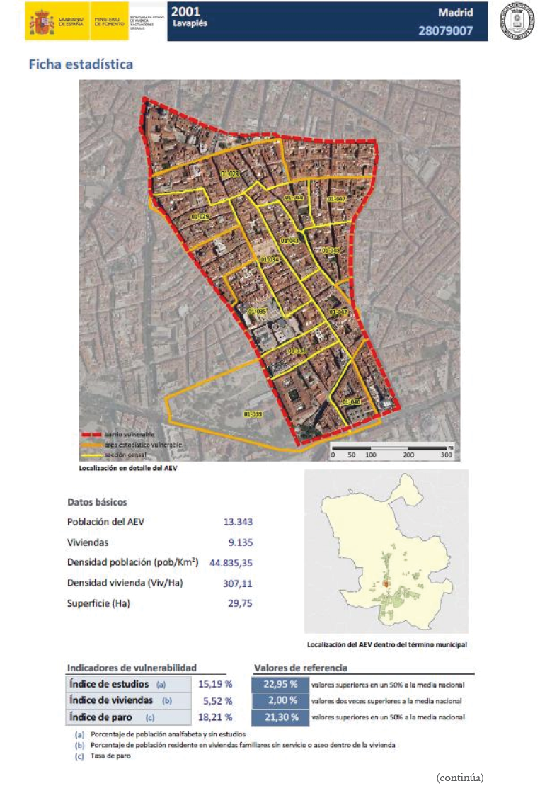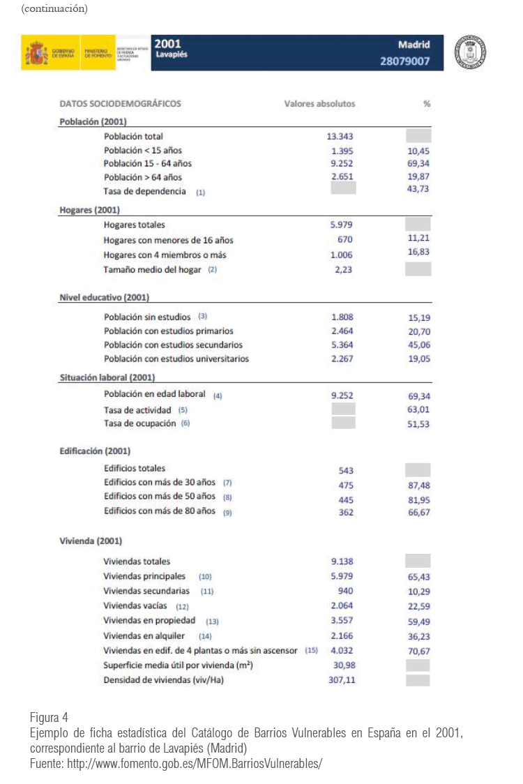• La información correspondiente a cada barrio vulnerable se organiza mediante una ficha urbanística de descripción del barrio, que trata de reflejar su realidad actual tanto urbana como social, y una ficha estadística (referida al área estadística vulnerable asociada) con toda la información estadística y los indicadores de vulnerabilidad. Esta última se presenta a modo de ejemplo en la figura 4.
