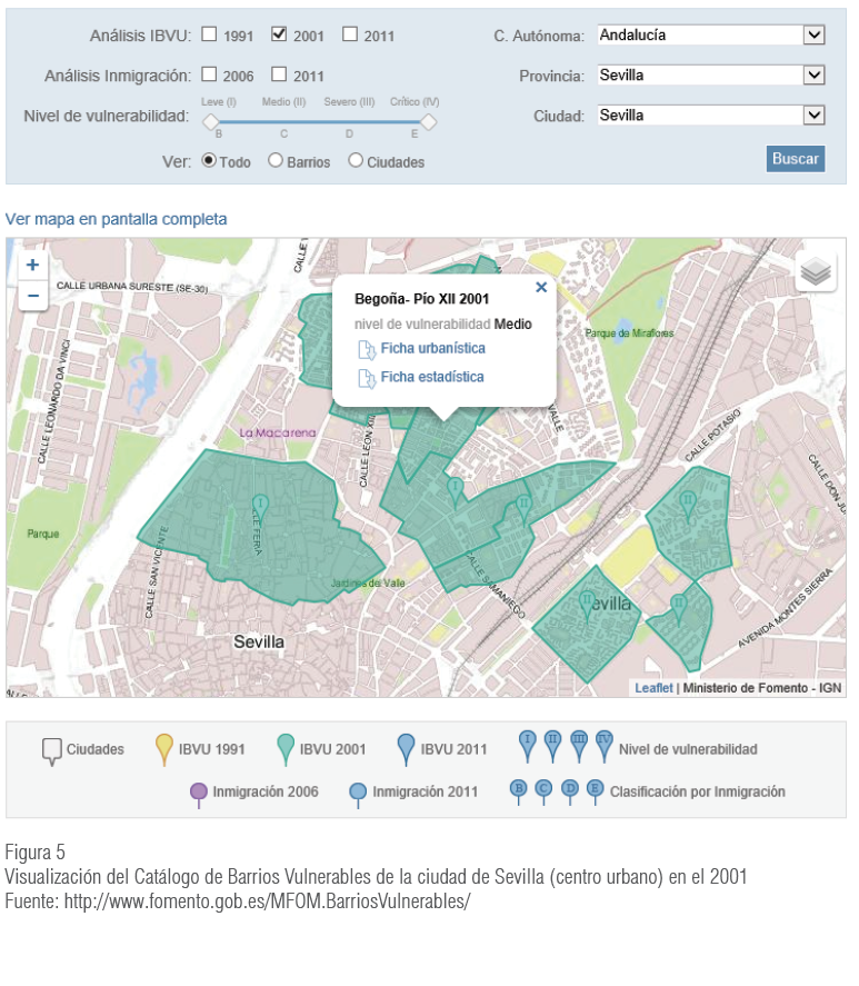 Esta vocación queda manifiesta en el Visor del Catálogo de Barrios Vulnerables, de acceso público en internet, que permite visualizar los barrios identificados como vulnerables sobre un mapa o sobre una fotografía aérea y descargar las fichas informativas (urbanística y estadística) referidas a cada uno de ellos. El cuadro de diálogo sirve para seleccionar y filtrar diferentes opciones de búsqueda: por barrios o por ciudades, por año o por nivel de vulnerabilidad. Existen dos series de indicadores de vulnerabilidad: los tres IBVU (paro, nivel de estudios y carencias en las viviendas), disponibles para 1991, 2001 y 2011; y la serie del indicador de inmigración, disponible para el 2006 y el 2011. Debajo del mapa se ofrece una tabla de resultados con la información de los elementos seleccionados y visualizados en el mapa, que puede también ser descargada para su consulta. La figura 5 muestra un ejemplo de visualización.