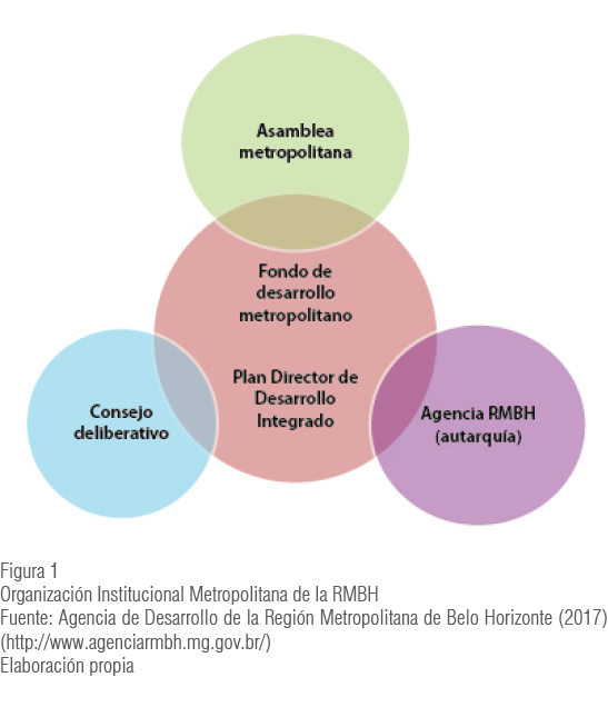 En Minas Gerais, el Gobierno metropolitano se basa actualmente en una organización institucional para la gestión y planeamiento que está compuesta por tres órganos, conforme se aprecia en la figura 1: la Asamblea Metropolitana, responsable de la definición de las macrodirectrices y la interposición de recursos a las decisiones del consejo; el Consejo Deliberativo de Desarrollo Metropolitano, que decide sobre los asuntos relacionados con el Plan Director y el Fondo Metropolitano (instrumentos de la organización destinados al planeamiento y al soporte financiero, respectivamente), así como con las funciones públicas de interés común; y la Agencia de Desarrollo Metropolitano, órgano con función ejecutiva, de soporte técnico y apoyo a los municipios.