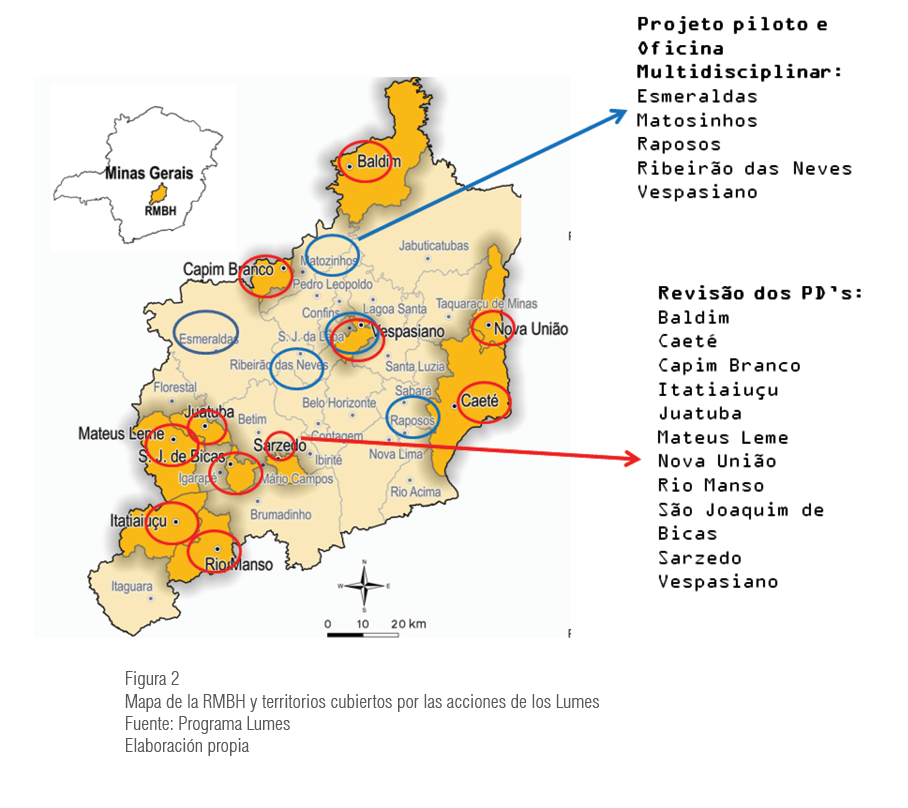La figura 2 muestra el mapa de la RMBH, donde destacan los municipios que han participado hasta el momento en el programa de los Lumes.