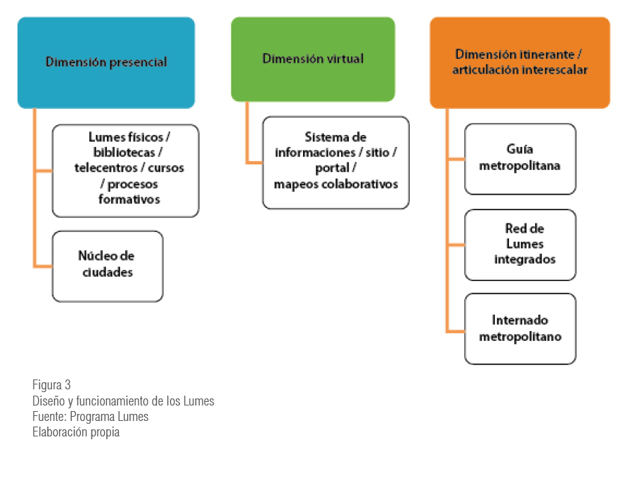 Los Lumes se estructuran y actúan en tres dimensiones y en seis programas integrados, presentados en la figura 3. Los diversos proyectos —aún en proceso de delineamiento y experimentación con los diversos actores que forman parte del planeamiento metropolitano— caminan en paralelo, cada uno con sus objetivos específicos y acciones correspondientes.
