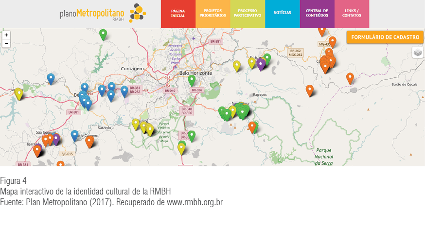 e ingresar a http://www.rmbh.org.br/mapa.php). A partir de estas inves-tigaciones, también se elaboró una matriz de análisis del perfil de los municipios de la RMBH que cuenta con tres pilares: cultura y patrimonio histórico; cultura y turismo; organización social, deporte y esparcimiento. Esto ayuda a comprender y trazar el perfil de formación histórica, y principalmente la identidad cultural de la Región Metropolitana de Belo Horizonte (Santos Soares, Rocha, Lares y Lazzarini, 2015).