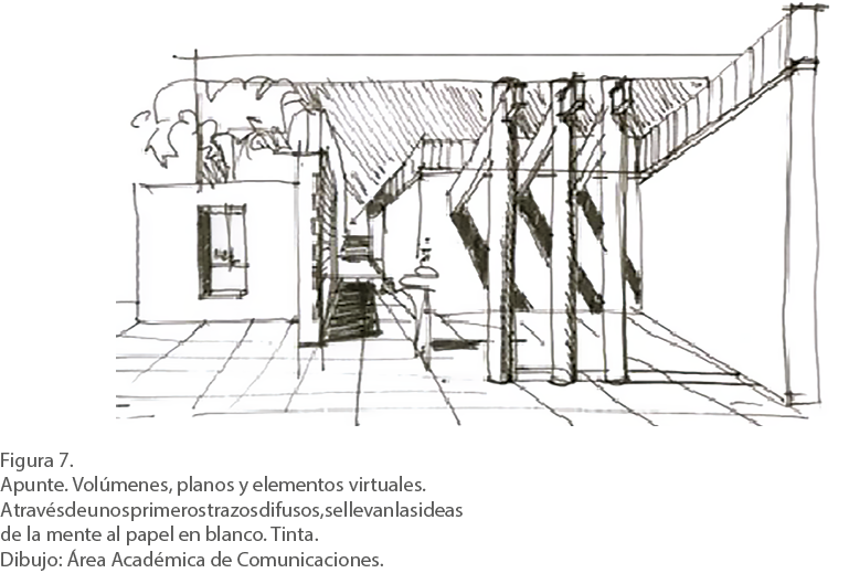 Así, entendemos el dibujo de arquitectura como un verdadero procedimiento creativo de búsqueda e indagación de ideas arquitectónicas que, a medida que se conciben, se dibujan, y se definen, se plasman en un punto determinado de su proceso de desarrollo.