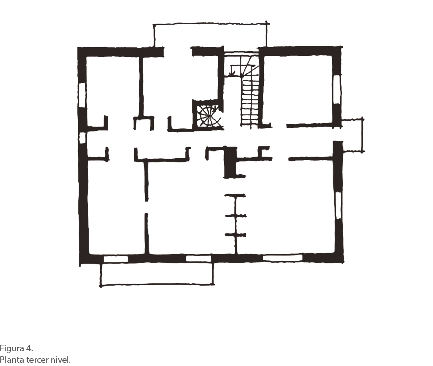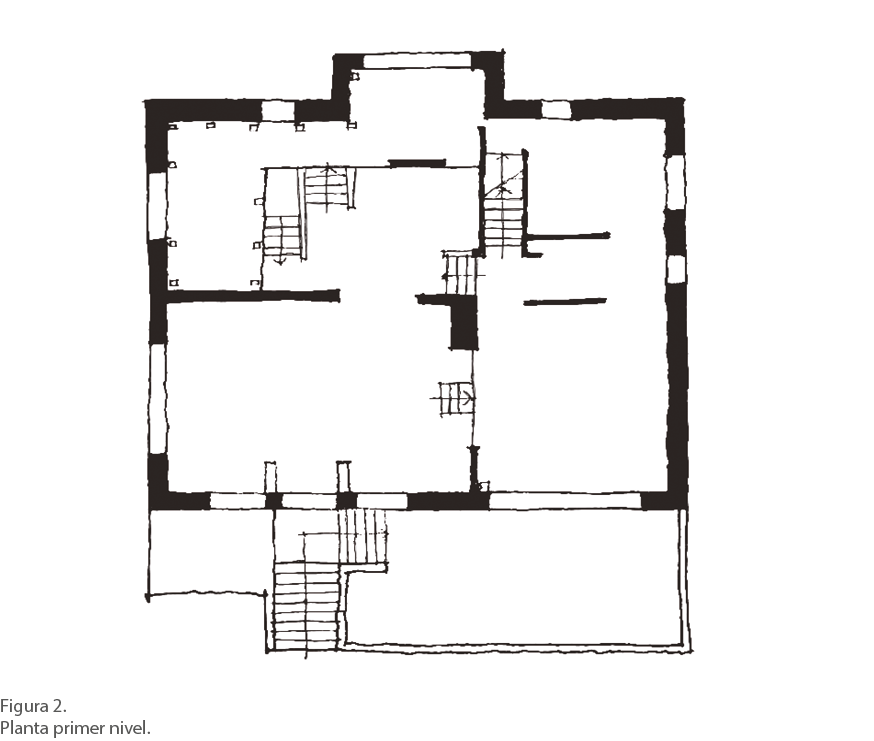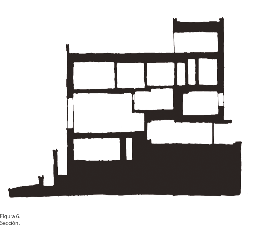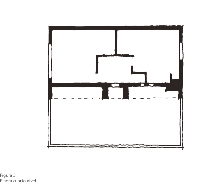 La línea oblicua de visuales desde el comedor al salón continúa hacia el exterior, traspasando la ventana del salón […] La línea de visuales parece desarrollarse paralelamente a la pendiente del sitio; esto es porque la diferencia de nivel entre el comedor y el salón es paralela a la diferencia de nivel en el terreno, tanto longitudinal como lateralmente (Van de Beek, 2008).