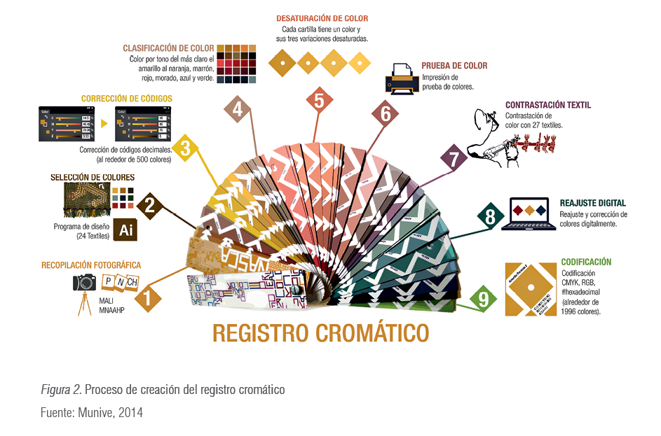 • Color. La diseñadora gráfica Leila Munive encontró que los especificadores internacionales de color —como Munsell (Estados Unidos, 1915), RAL (Deutsches Institut fur Gütesicherung und Kennzeichnung, 1927) o Pantone (Estados Unidos, 1956)— no representaban los tonos exactos de color de los textiles costeños, realizados a partir de pigmentos naturales, con una gran diversidad cromática debido a la multiculturalidad local. Es así que crea un especificador propio denominado Perú a Color, resultado del registro cromático de textiles precolombinos de la costa del país, como “elemento para fortalecer la identidad nacional en proyectos de diseño y arqueología” (Munive, 2014, pp. 5-6).