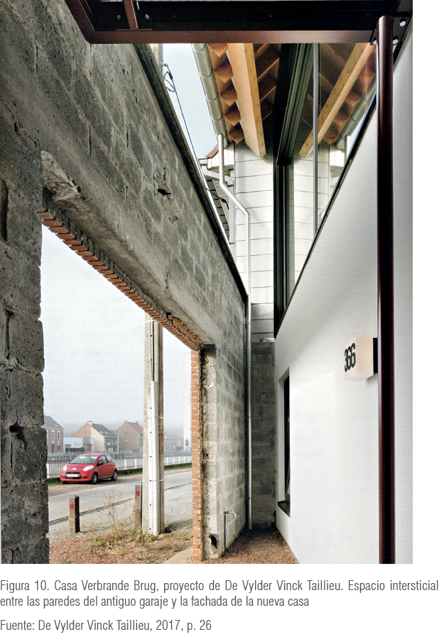 En otros proyectos, la estrategia consiste en desacreditar la materialidad. En este sentido, algunos edificios presentan muros de ladrillo que en realidad son puertas secretas (casa Weze), muros aparentemente de fachada que esconden un patio exterior (casa Verbrande Brug) (figura 10); montantes que usualmente quedan ocultos (balloon frame) y puntales de obra que permanecen se convierten en un acabado en apariencia inconcluso (casa Rot Ellen Berg). También entienden como lícita la superposición de un muro cortina absolutamente transparente delante de un muro de ladrillo, así como la superposición de tendales domésticos sobre la superficie lisa y reflectante del citado muro cortina (Les Ballets C de la B and LOD).