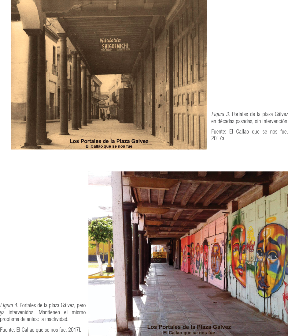 La visita al centro histórico del Callao, entonces, fue productiva en el sentido de que se detectó que las pinturas murales, si bien atraen la atención de las personas, no pueden funcionar solas: el edificio abandonado o en pésimas condiciones tiene que ser restaurado y estar en uso público en la primera planta; de lo contrario, por más murales que se realicen, la zona va a seguir descuidada y la sensación de peligro por los pasajes y las calles anexas a la iglesia matriz persistirá. Esto sucede con el monumento abandonado frente a la plaza Gálvez, sobre el cual Entes y Pésimo realizaron grafitis vistosos y coloridos; sin embargo, no se obtuvieron los resultados esperados (figuras 2 y 4).