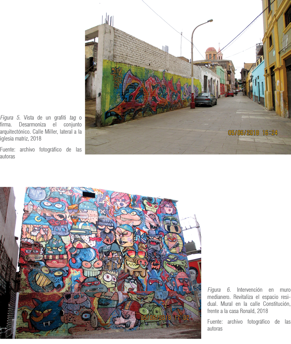 La problemática encontrada en el centro histórico del Callao es que el patrimonio, tanto material como inmaterial, se ha visto afectado, lo que ha generado un debate respecto al real aporte de estos murales, si se deben continuar realizando o no (Castillo, 2017). Muchos de los edificios intervenidos son monumentos, se encuentran dentro de una zona monumental o ambiente urbano monumental. Esto quiere decir que poseen un valor artístico e histórico en sí mismos que el grafiti sobrepuesto desmerece. Al pintar murales sobre las fachadas de antiguas casonas no solo se atenta contra el Reglamento Nacional de Edificaciones, entre otras normas oficiales, sino que se da el errado mensaje de que estas adquieren valor en ese momento, como si se estuviera pintando sobre un lienzo en blanco (figuras 1, 2 y 4).