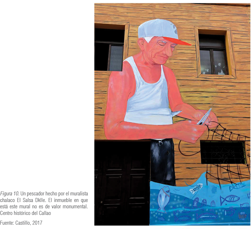 Se encontró también otro tipo de murales, pintados esta vez por el artista El Salsa DKlle, uno de los más conocidos del Callao. Su grafiti expresa netamente retratos de chalacos, en su mayoría víctimas de la delincuencia (figura 11). A continuación, una imagen del mural mejor trabajado de este artista (figura 10). Se trata de un personaje que cualquiera puede identificar netamente como chalaco, pues representa una de las actividades más importantes del puerto del Callao: el tejido de redes para la pesca. Expresar en la totalidad del inmueble este personaje —quien es, por cierto, vecino chalaco y padre del muralista— revive la calle donde se sitúa; sin embargo, como se mencionó anteriormente, para conservar la actividad del lugar es importante que exista un uso comercial o cultural que haga de su recorrido una necesidad.