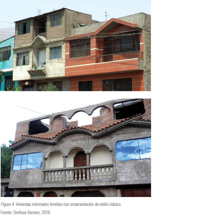 Todos estos estilos han perdurado en la memoria del habitante limeño, a tal punto que son utilizados en las fachadas de sus construcciones informales. Podemos ver viviendas de zonas populares de Lima en las que el maestro albañil aplicó estilos de ornamentación profusos, como columnas con decoraciones de animales y vegetación, y utilizó líneas recargadas y colores llamativos. Esta es una clara muestra de la fusión que se ha producido entre la arquitectura clásica y la arquitectura chicha o informal. En ella prevalecen elementos propios de las comunidades provincianas, pero también hay elementos estilísticos europeos que llegaron a Lima y que aún se mantienen vivos en el subconsciente colectivo.