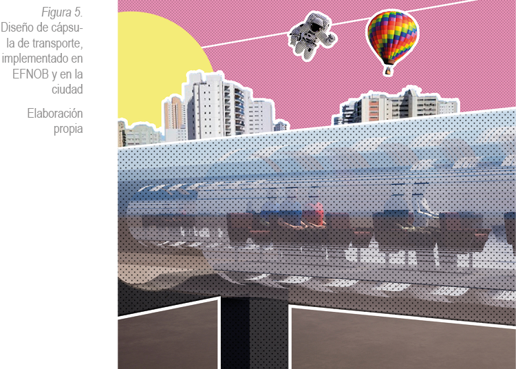 Los modos de transporte se superpondrían a través de rieles por cápsulas de alta tecnología y alta velocidad (figura 5) que se elevarían desde la distancia del suelo, descongestionando el tráfico y creando una intermodalidad entre lo que ha sido creado y lo que ya existe, ya que, a pesar de ser una capital, no hay metro ni trenes que abastezcan la ciudad.